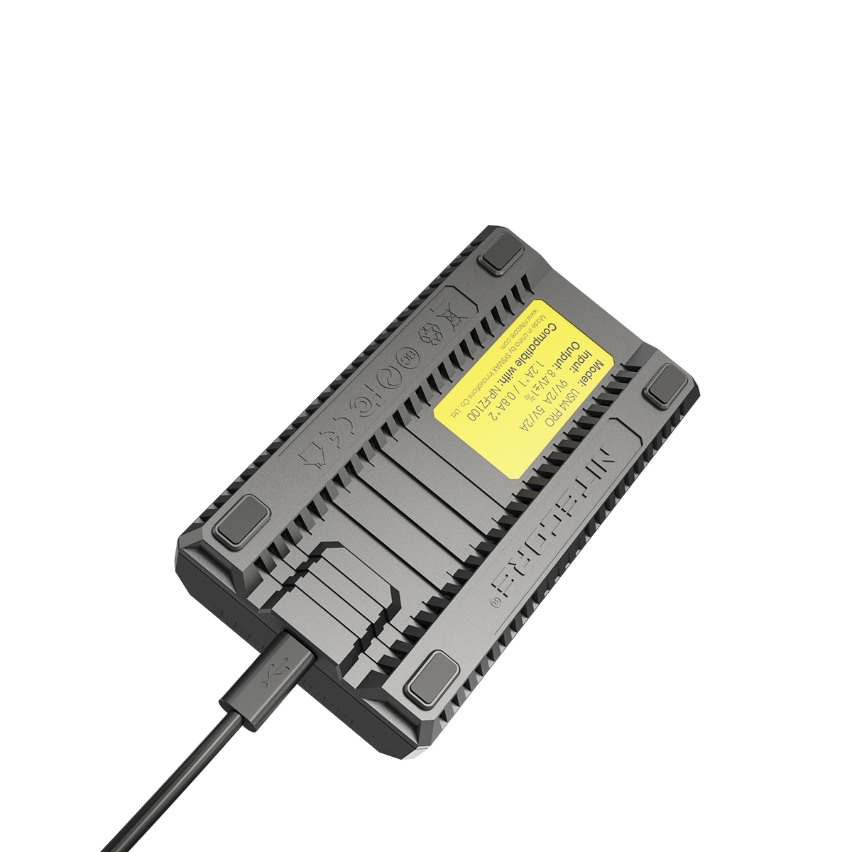 USN4 Pro is QC 2.0 available charger which can charge two NP-FZ100 batteries simultaneously with the USB input and display real-time information of the charging status.