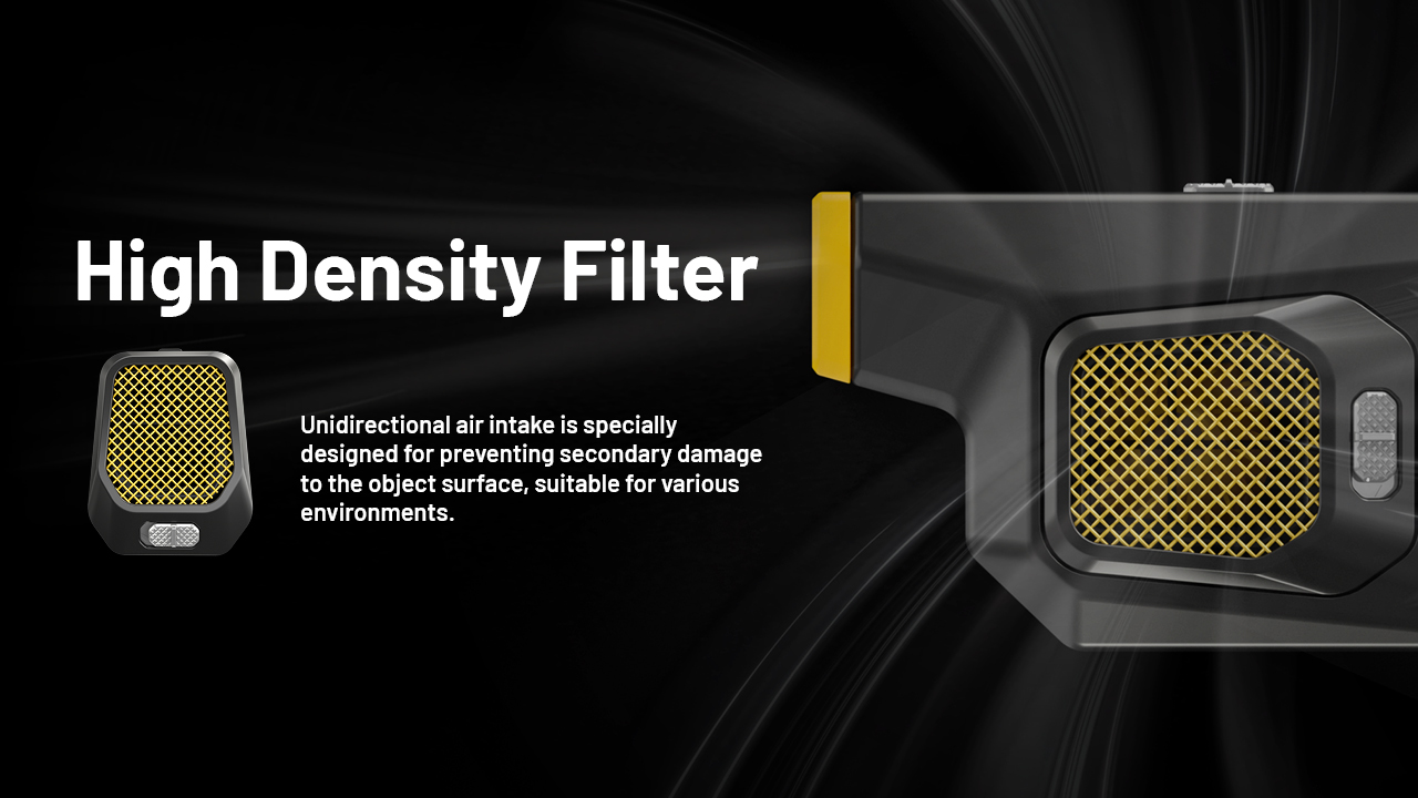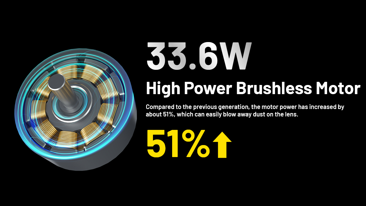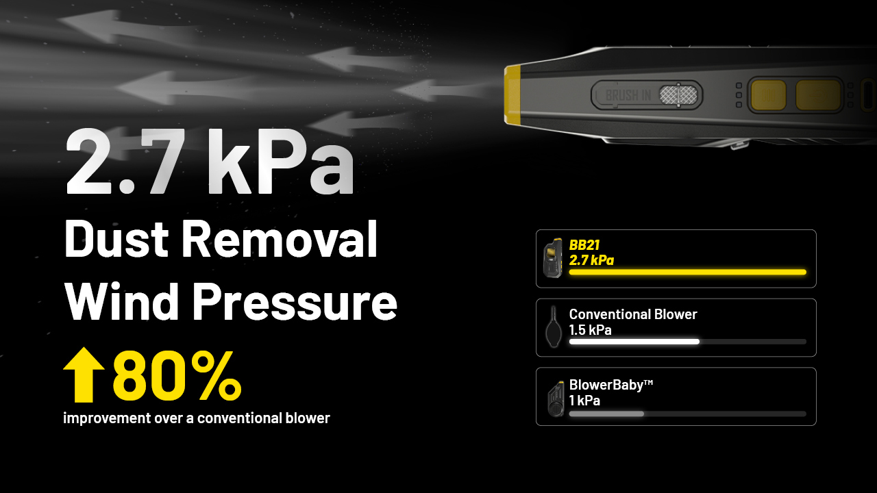 The BB21 features a 33.6W high-powered motor, optimized airducts, and a 42mm (1.7") integrated impeller. With a dust removal power of 2.7kPa and wind speeds reaching up to 80 km/h (49.7 mph), its ergonomic design ensures effortless one-handed operation.