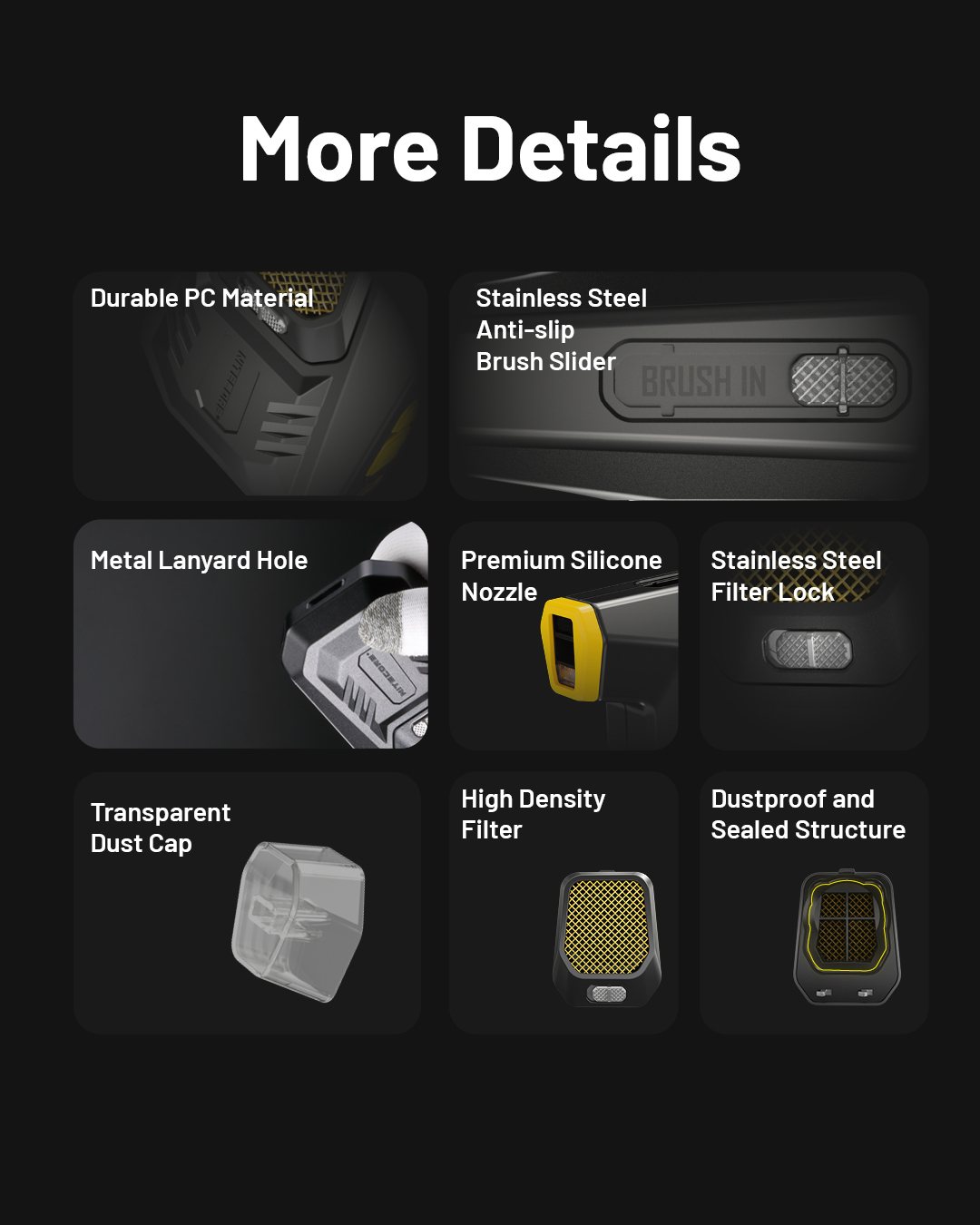 Accessories: USB-C Charging Cable, Dust Cap, Magnetic Quick Release Brush